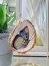 The oyster shell was painted with mother of pearl so that the butterfly really pops. The edges of the shell were gilded with liquid gold leaf and the entire shell was sealed with a protective gloss finish. The ornament is strung with a white satin ribbon.