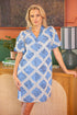 35298 Leaf Print Embroidered Lace Bubble Sleeve Dress: Blue / L