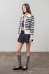 Expertly crafted with a sailor collar and contrast edge knit detailing, the Moon River Knit Cardigan is a must-have addition to your wardrobe. Its timeless stripe pattern adds a touch of elegance, while the front tie and long sleeves provide both style and comfort. Elevate your look with this versatile piece.