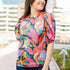· 100% Silky Polyester · Ruffle Mock Neck · Button Keyhole · Elbow-length Puff Sleeves