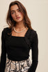 - Square Neckline: Offers a chic and timeless design that flatters the neckline. - Ruffle Detailing: Delicate ruffles along the shoulders add a romantic and feminine touch. - Long Sleeves: Provides full coverage while maintaining an elegant and stylish look. - Stretch Rib Fabric: Made from a soft, ribbed fabric with excellent stretch, ensuring a comfortable and snug fit. - Versatile Design: Complements both casual and dressy outfits, making it a wardrobe essential. - Model is 5' 7" 31-24-35 and wearing a size Small Crafted from stretchy rib fabric, this top combines comfort with style. Its sophisticated design makes it perfect for various occasions, from casual brunches to semi-formal gatherings. Pair it with a tulle skirt for a dreamy look or with high-waisted jeans for a modern, casual vibe.